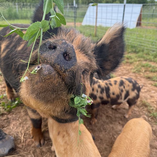 The Idaho Pasture Pigs at Virginia Gold Ranch are a perfect example of what happens when thoughtful breeding meets regenerative farming. Developed in the United States, this rare heritage breed was created by blending the best traits of the Duroc, Old Berkshire, and Kunekune to produce a pig that thrives entirely on pasture. Unlike commercial hogs bred for confinement and rapid weight gain, Idaho Pasture Pigs are natural grazers—using their short, upturned snouts to gently forage grasses, clovers, roots, and acorns without destroying the soil. This makes them ideal partners in our regenerative ecosystem, where their movement helps aerate the land, cycle nutrients, and improve fertility for future growth.